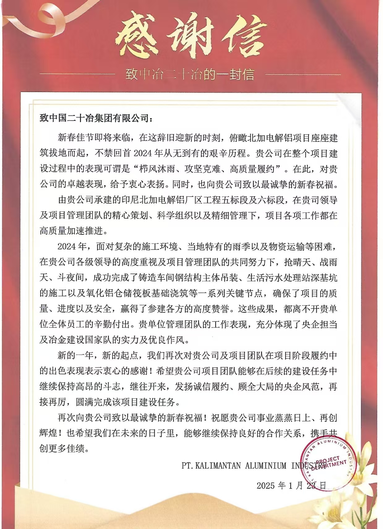 On January 25th, as the Spring Festival approached, the Overseas Engieering & Construction Company’s North Kalimantan Electrolytic Aluminum Project in Indonesia received good news: the project team was awarded a letter of praise from the project owner. This followed a letter of gratitude from the supervision unit on December 24, 2023, marking another recognition of the project team’s efforts by the owner.
