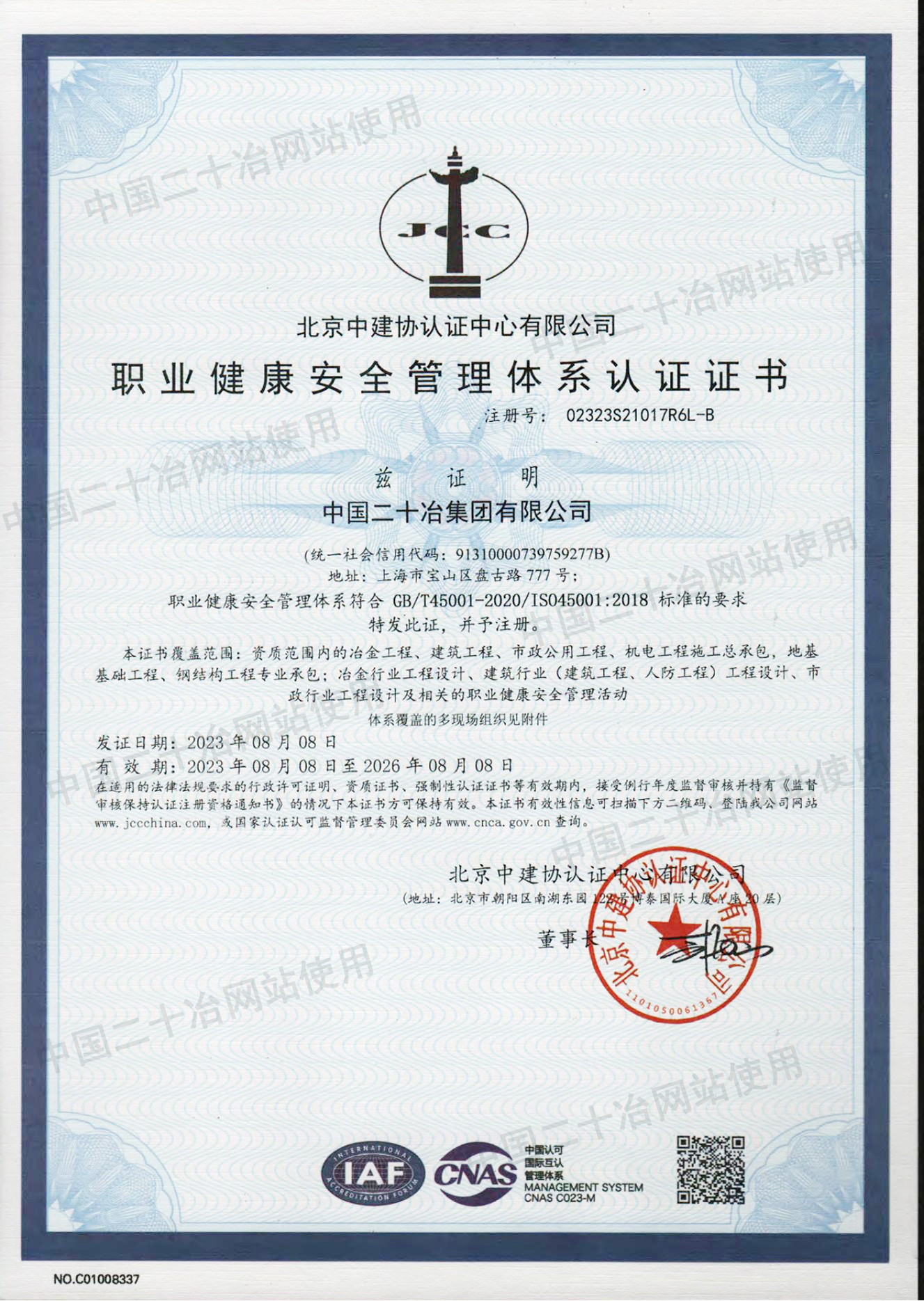 职业健康安全管理体系认证证书