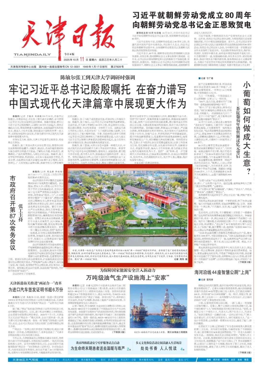 10月11日,《天津日报》头版以图片新闻形式报道天津尊龙凯时·(中国区)人生就是搏!承建的第一机床总厂城市更新项目津一·PARK西区对外开放。
