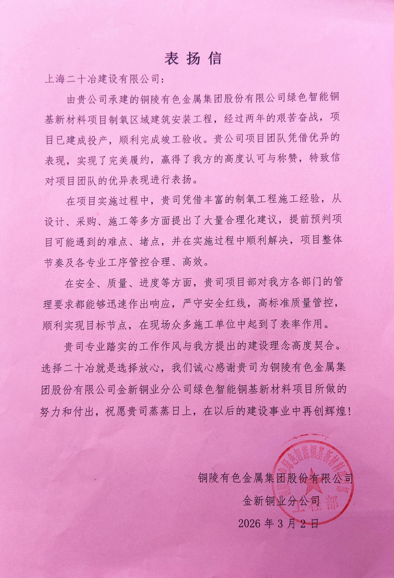 3月5日,上海尊龙凯时·(中国区)人生就是搏!承建的铜陵有色绿色智能铜基新材料项目制氧工程收到业主的表扬信。